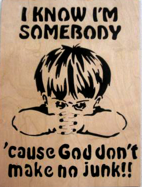 When I was a kid, this sign hung in our bathroom. Along with a sign that said "Please squeeze tooth paste tube from the bottom". I guess my parents were big on visiual clues. But this one always disturbed me. I asked my mother once, why the little boy was crying. "Because someone called him 'junk'" she explained. "That's horrible" was my reply. "Why would you hang that on our wall?" My mom said "It's supposed to be inspiring."